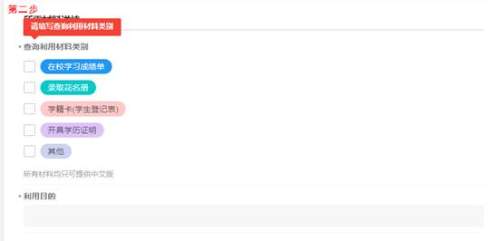 第二步:选择需要查询的档案材料类别及填写对应的利用目的。如果需要查询录取花名册需要提供高考省份或直辖市(录取生源地)及当年录取专业,如需要其他档案材料则选择【其他】进行手工录入填写。