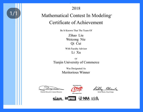近日,2018年美国大学生数学建模竞赛(MCM/ICM)成绩公布,由理学院统计系主任徐立老师指导,经济数学实验班15级刘子豪、应用统计专业15级聂惟聪和能源与动力工程专业15级崔奇三位同学组成的参赛团队荣获大赛一等奖。据主办方网站公布的统计数据,在20602支参赛团队中一等奖获奖率仅为10%。