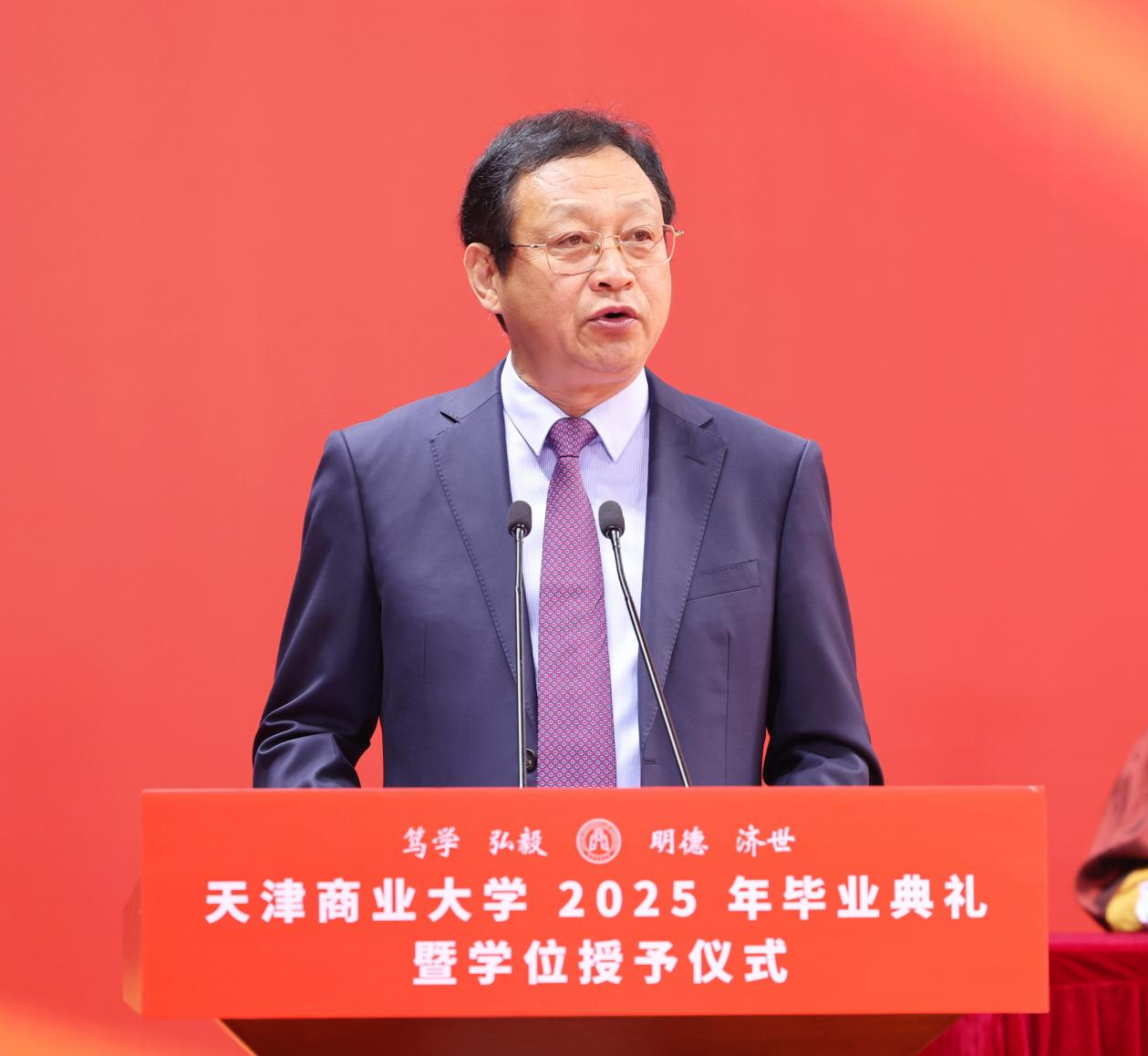 陈冠益对全体毕业生提出三点期许:一是明确人生目标,勇于奉献担当。要将爱国情、强国志、报国行自觉融入新时代的奋斗之中,将个人成长的“小我”融入国家发展战略的“大我”之中,勇担时代使命,在城市、在乡村、在基层、在每一个可以创造价值的地方,毫无保留地奉献青春与才干,在平凡的岗位上不断发光发热。二是练就过硬本领,持续增长才干。要敢于在艰苦环境中摸爬滚打,勇于在急难险重任务中接受考验,在经风雨、见世面中壮筋骨、长才干;要在毕业后继续丰富自身的知识结构,坚持不懈地进行前沿知识的更新迭代,求新知、守良知,用智慧把握并驾驭未来的人生航程。三是自信自立自强,保持积极心态。要时刻保持自立自强的人生态度,满怀信心迎接未来挑战,做心中有梦、脚下有路、坚韧不拔的天商人;要敢于直面困难,勇于接受挑战,正确看待成败得失,接纳真实的自我,保持身心健康,在工作、家庭、休闲等不同领域之间维系动态平衡,感受日常的美好与满足。他诚挚邀请大家常回家看看,为学校发展积极建言献策。