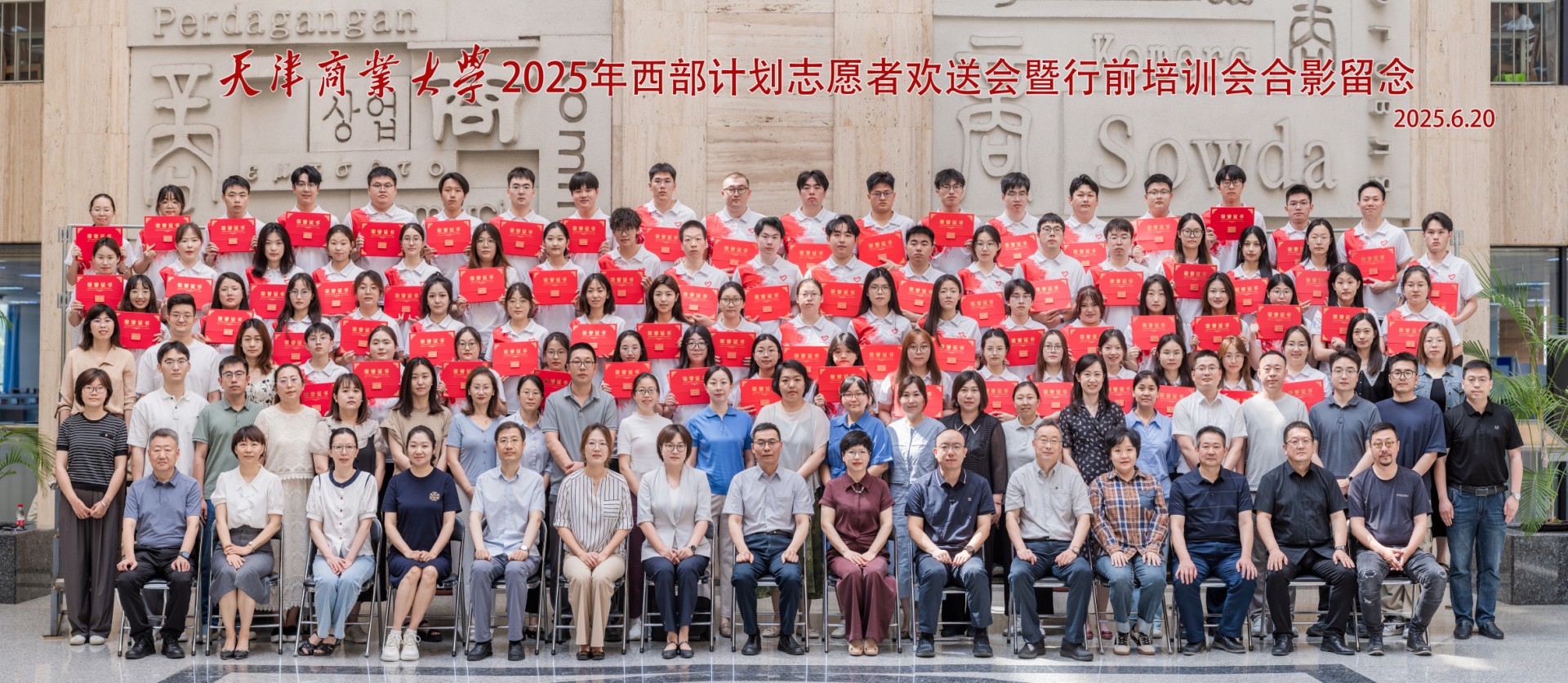 王立云向西部计划志愿者授旗,相关职能部门负责人为西部计划志愿者代表颁发优秀毕业生荣誉证书,全体参会人员观看了西部计划宣传片——《从天商出发,让青春在西部闪光》。