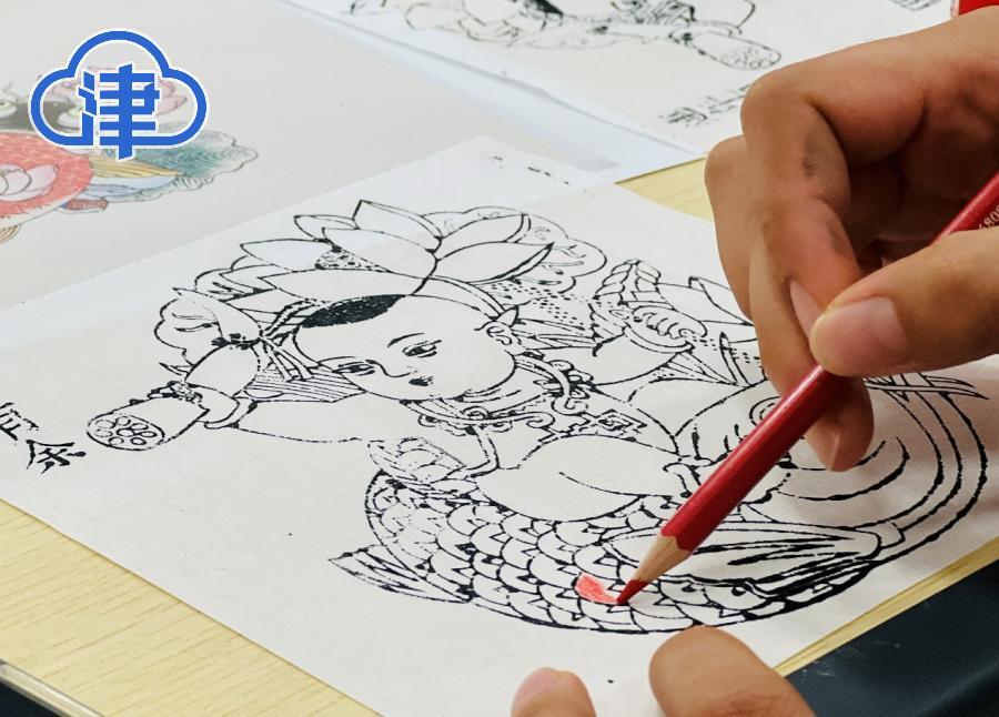 在彩色上色时,学生们手握画笔,以红、绿、黄等传统色彩为年画注入生机。从人物衣饰到背景纹样,每一笔都细致勾勒。当单调的线条被缤纷色彩填满,年画中孩童的笑脸、喜庆的场景跃然纸上,大家真切感受到杨柳青年画“妙在点染”的艺术精髓。