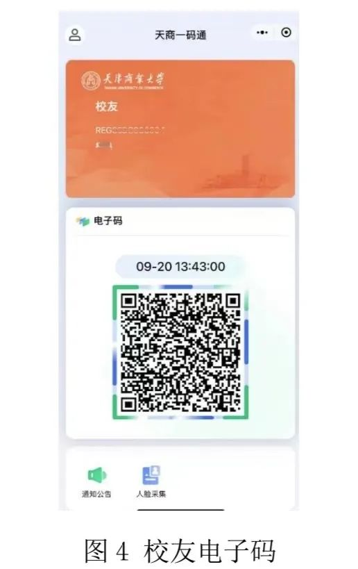 4.审核通过后重新进入“天商一码通”,即可获取正式校友码,校友码可以作为出入校园的凭证,也可以通过“人脸采集”功能上传人脸信息,实现人脸识别通行。