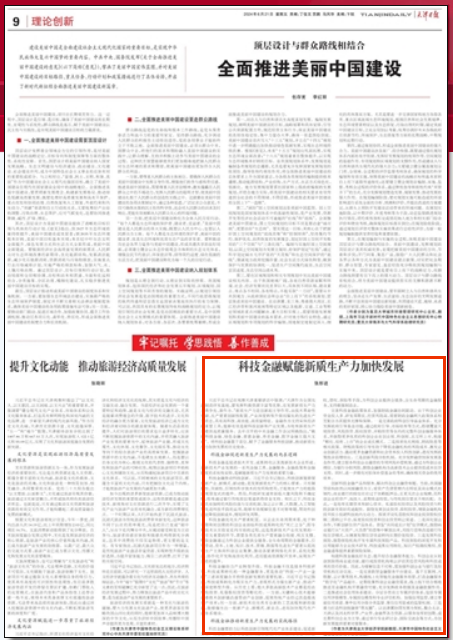 6月21日,《天津日报》(理论创新版)刊发我校经济学院、天津市中国特色社会主义理论体系研究中心天津商业大学基地研究员张彤进副教授理论文章“科技金融赋能新质生产力加快发展”。文章指出,新质生产力是创新起主导作用,由技术革命性突破、生产要素创新性配置、产业深度转型升级而催生的先进生产力质态,具有高科技、高效能、高质量特征。科技金融有助于推动科技创新、优化生产要素配置、助力产业转型升级,是赋能新质生产力发展的重要力量。文章从完善科技金融政策体系,加强财政金融协同联动;创新科技金融产品和服务,解决科创企业融资难题;构建科技金融良好生态,提升综合金融服务能力三个层面对科技金融推动新质生产力发展的实践路径进行了具体阐释。