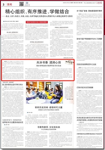 4月24日,《天津日报》报道学校开展世界读书日活动。我校图书馆启动第七届“天商共读”系列活动,以“传承优秀文化·赓续津沽文脉”为主题,旨在展示天津深厚的文化底蕴,引导学生通过阅读和实践进一步增强文化自觉与文化自信,滋养心灵、涵养品行。